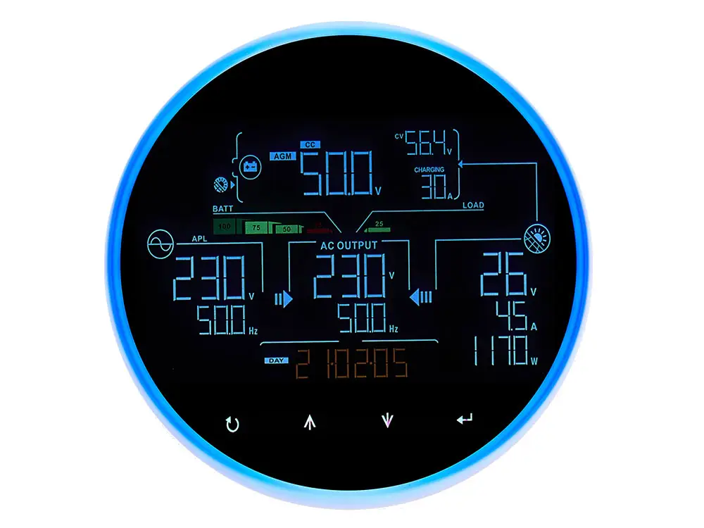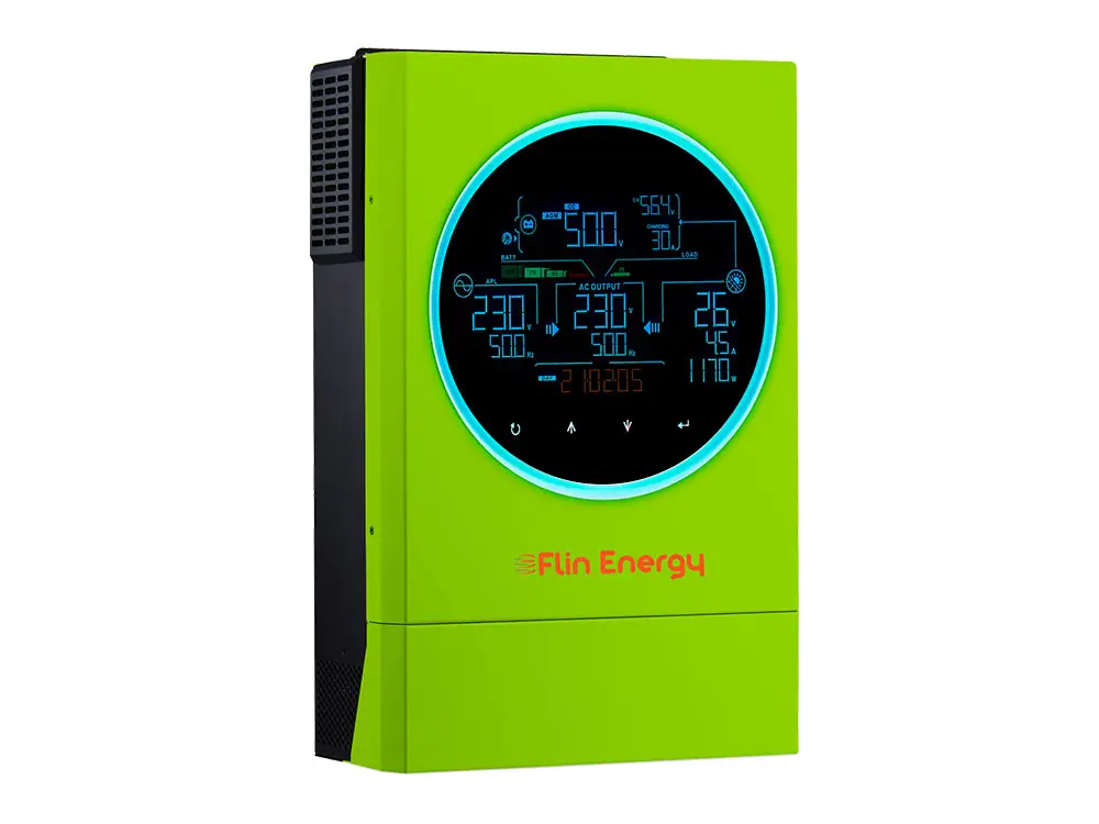 FlinInfini Turbo MPPT 6kW-48V Solar Hybrid Inverter is a new generation, future ready inverter with a creative design and a big 4.3-inch LCD display with RGB LED ring and touch buttons. It comes with dual output feature.Now connect emergency loads on one output and non-emergency loads on second output and control how you want to use battery backup for non-emergency loads. The second output can be intelligently controlled by inverter brain using multiple parameters.